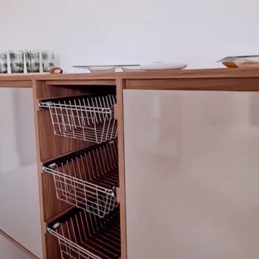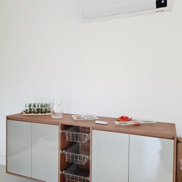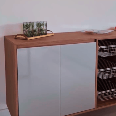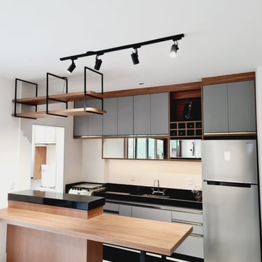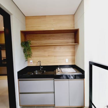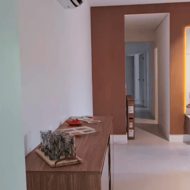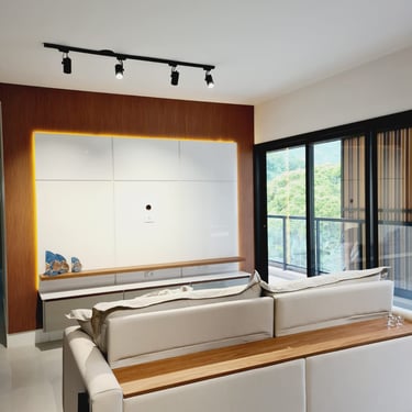 Nesta sala, fizemos um painel de parede inteira, também aplicamos um painel de televisão. Também realizamos a bancada, combinando com toda a marcenaria da sala.