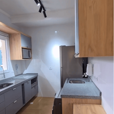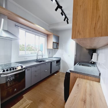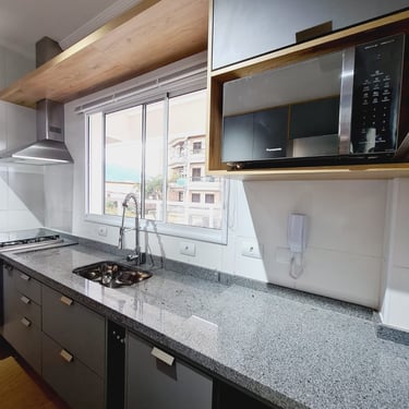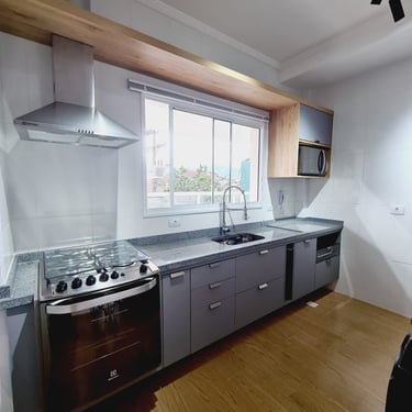 Nesse projeto quisemos explorar um conceito de cozinha mais clean, deixando o menor número de objetos visíveis na bancada. Aproveitamos toda a extensão da pia embutindo porta condimentos, porta pano de prato, lixeira para orgânicos e inorgânicos, gavetões para panelas e até uma fruteira com frente de vidro.