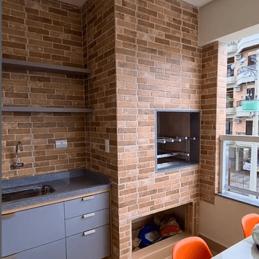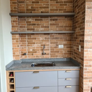 Na varanda, colocamos um armário inferior com gavetões para guardar objetos maiores de churrasco e um garrafeiro de bebidas.