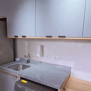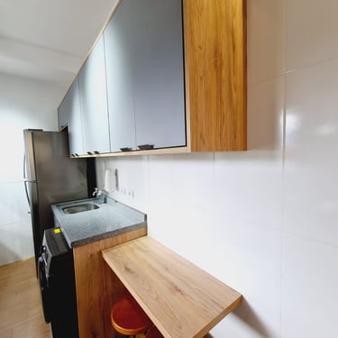 Na parede oposta, além de armários para servir de despensa e lavanderia, conseguimos inserir uma bancada para pequenas refeições.