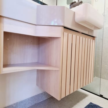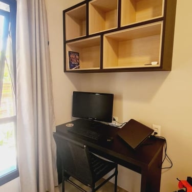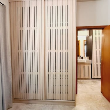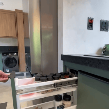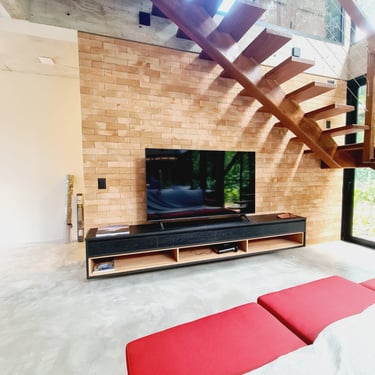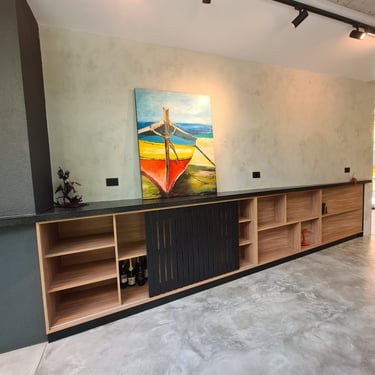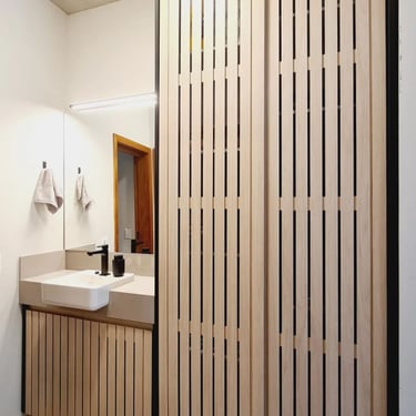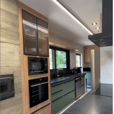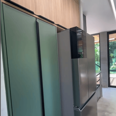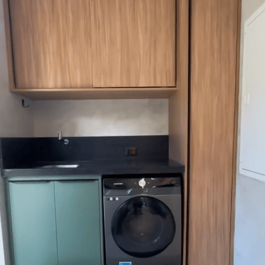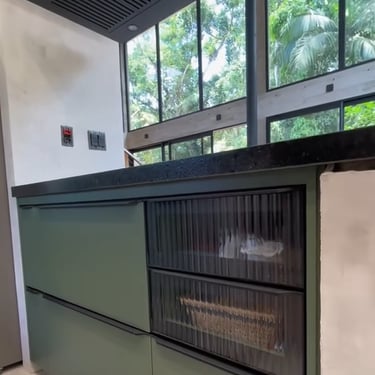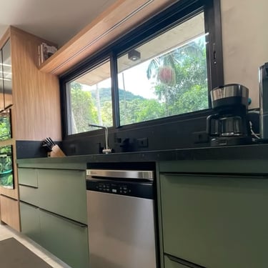 Casa na praia de Itamambuca, cercada de área verde, o que inspirou as cores e materiais do projeto. Na cozinha, optamos pelo MDF na cor verde floresta da linha Velotto da Duratex, com acabamento aveludado, combinado com a madeira Cumaru da Arauco. Também inserimos vidros canelados em alguns móveis e puxadores facetados na cor preta. Todas as ferragens são em aço inox, inclusive os parafusos para evitar a oxidação com o tempo. O interior dos móveis é de MDF Ultra, o mais resistente a umidade. O projeto também inclui a lavanderia, com vassoureiro, gavetões e muito espaço.