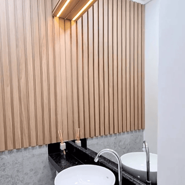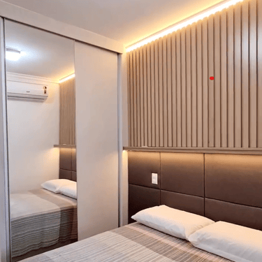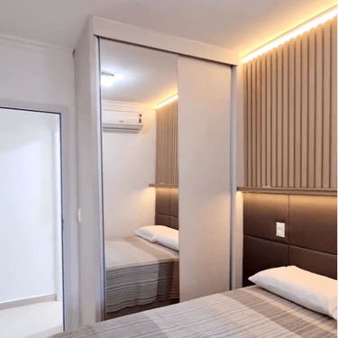 Suíte com painel de TV, cabeceira estofada, um lindo painel ripado acompanhado de LEDS que são super tendência nos projetos de interiores!